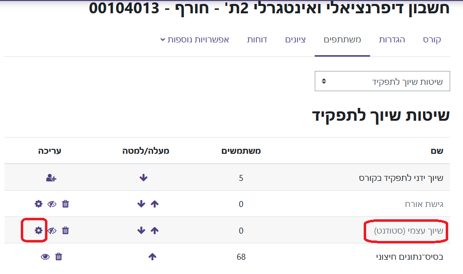 3. בעמוד הבא, מצאו את השורה "שיוך עצמי (סטודנט)" ולחצו על גלגל השיניים שבצד שמאל של השורה: