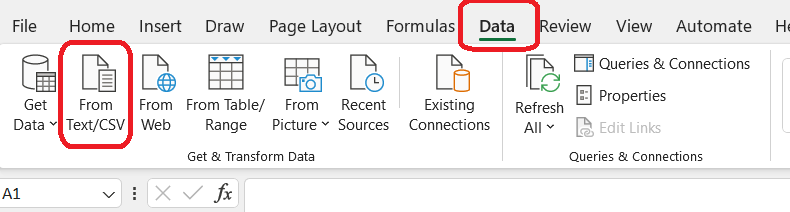 3. עברו לחוצץ Data ואז בחרו באפשרות של ייבוא מקובץ טקטס (From Text/CSV):