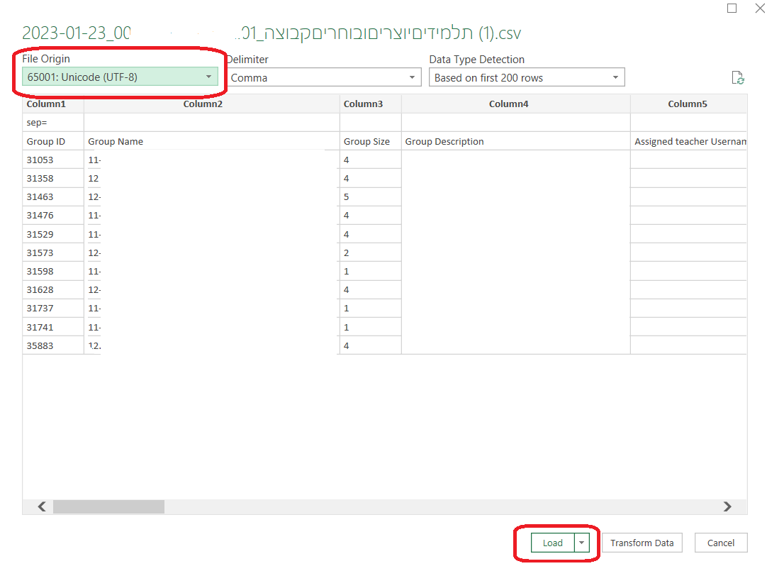 4. המערכת תציג חלון חדש ובו תצוגה מקדימה של הקובץ. שימו לב שניתן לשנות את הקידוד בפינה השמאלית העליונה, במידה והזיהוי האוטומטי של הקידוד המתאים לא צלח. לאחר שתראו את הטקסט בצורה תקינה - לחצו על Load.