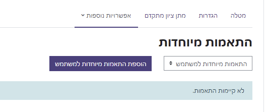 2. בשלב הבא ניתן לבחור האם מבקשים להוסיף התאמות מיוחדות למשתמש/ת או לקבוצה מתוך תפריט הבחירה בצד שמאל (ברירת המחדל היא למשתמש"). לחצו על הלחצן הסגול "הוספת התאמות מיוחדות למשתמש":