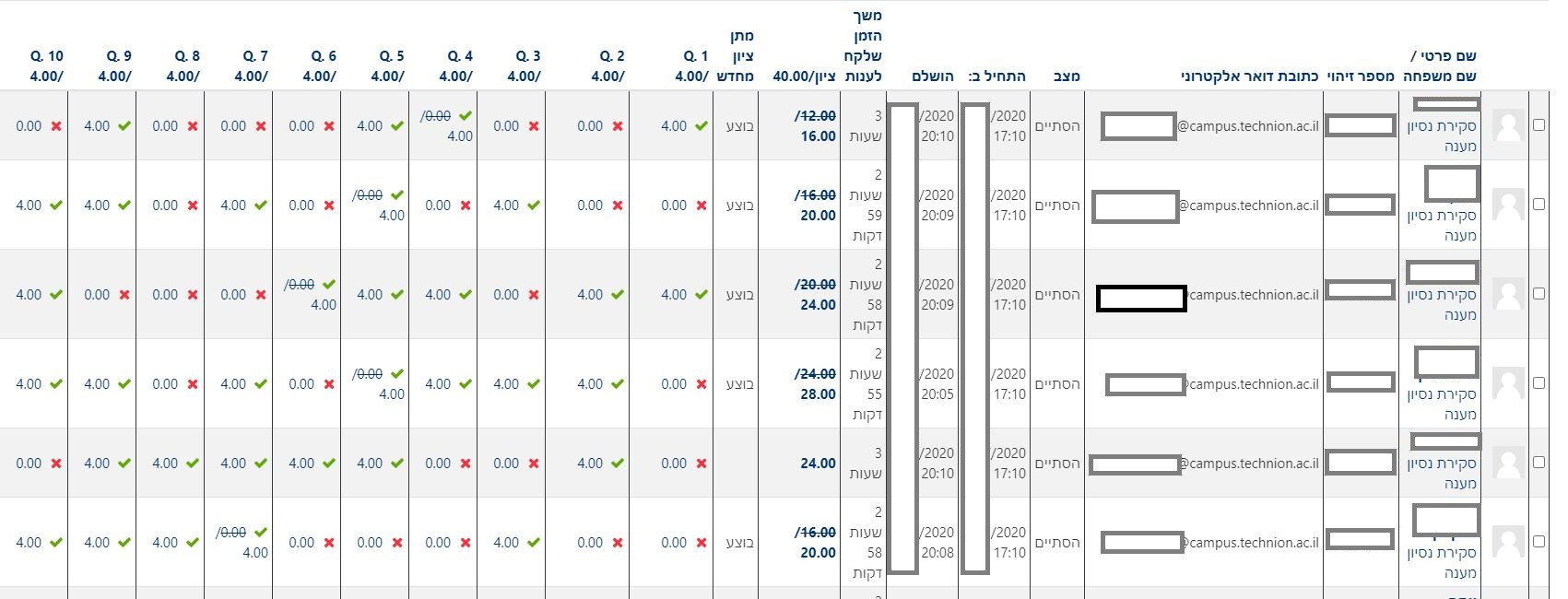 3. ניתן לראות את כל ניסיונות המענה (במידה ולסטודנט היו מספר נסיונות- כולם יוצגו כאן): פרטי הסטודנט, שעת התחלה, שעת סיום, משך הנסיון, היכן היו טעויות, כמה ניקוד קיבל, ציון מסכם וכו'.