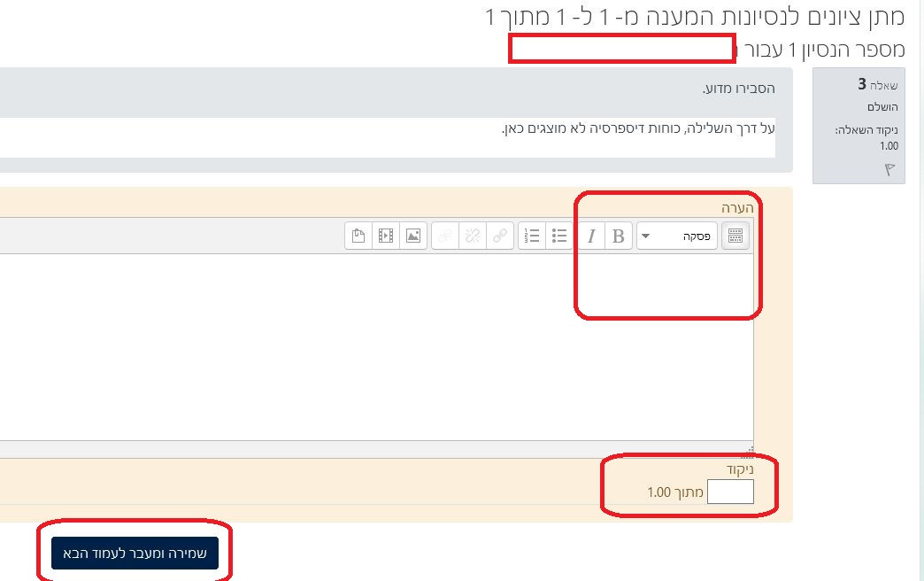 8. לחצו על הקישור של השאלה אותה אתם מעוניינים לבדוק ותועברו לעמוד הבדיקה של אותה השאלה לכל הסטודנטים. עבור כל סטודנט הזינו ציון והערות ושמרו בסיום. שימו לב שעברתם על כל העמודים: