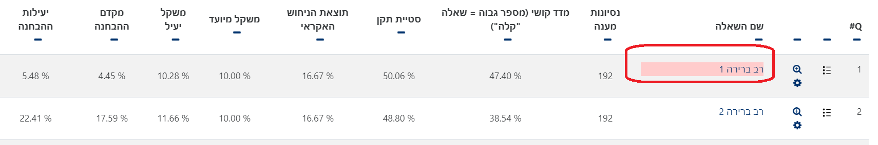 בבחן מסוג רב-ברירה, מומלץ להתייחס אל שני מדדים חשובים, המוצגים בתוצאות הסטטיסטיות: מדד הקושי ומקדם ההבחנה. מדדים אלה מאפשרים להעריך את איכות הפריטים. הערכים של שני המדדים הם מספרים בין 1- לבין 1 (100%- לבין 100%), כאשר עדיף ערך גבוה יותר.