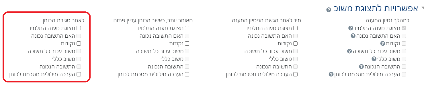 2. מצאו את החלק של "אפשרויות לתצוגת משוב" וסמנו בעמודה השמאלית ביותר "לאחר סגירת הבוחן" את השדות שתרצו לחשוף לסטודנטים (תצוגת מענה התלמיד תציג גם את השאלה עצמה, האם התשובה שסימן נכונה, ניקוד, משובים שונים, מה הייתה התשובה הנכונה). במידה ואינכם מעוניינים להציג לסטדונטים את שאלות הבחינה - ניתן לבחור להציג רק את הניקוד.