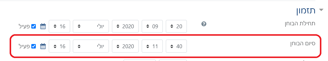 1. היכנסו להגדרות הבחן וודאו שמוגדר עבורו מועד סגירה. במידה והוא לא מוגדר - הוסיפו מועד סגירה (למשל, שעת סיום המבחן או כל שעה אחרת שכבר עברה)