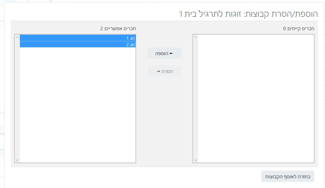 5. במידה וכבר קיימות קבוצות שתרצו לשייך לאוסף זה - בחרו את הקבוצות מתוך הרשימה ולחצו על "הוספה". בסיום לחצו על "בחזרה לאוסף הקבוצות".