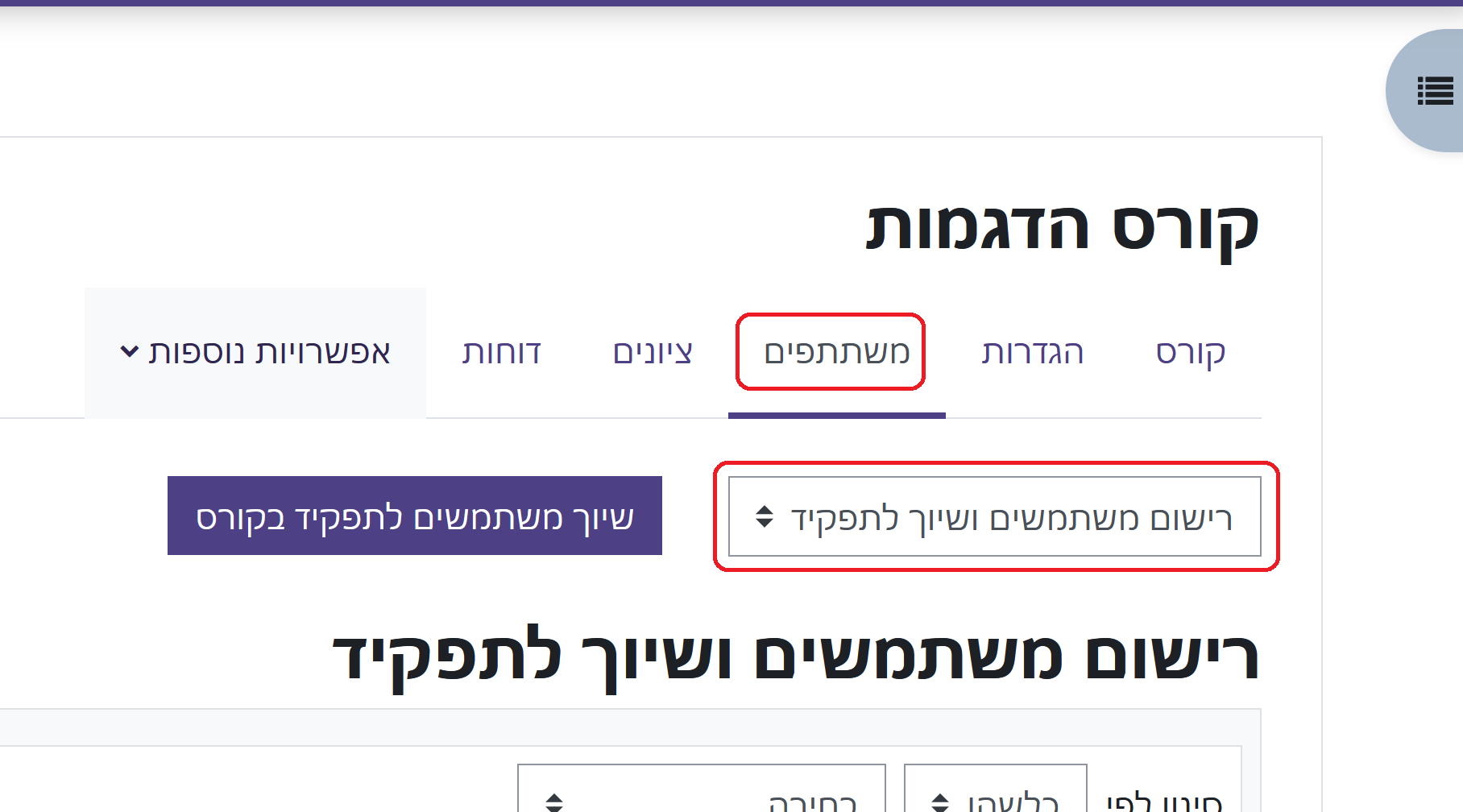 1. היכנסו לאתר הקורס, עברו לחוצץ "משתתפים" שנמצא מתחת לכותרת האתר. בעמוד שיפתח לחצו על "רישום משתמשים ושיוך לתפקיד" ובחרו בתפריט "קבוצות".