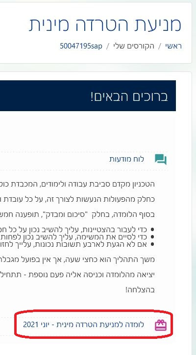 * מומלץ לבצע צילום מסך מלא (כולל שעון המערכת והשם של המשתמש המחובר כפי שמופיע בפינה השמאלית העליונה) של השקף בלומדה שבו רשום שהשלמתם אותה בהצלחה ולשמור צילום מסך זה במחשבכם האישי.